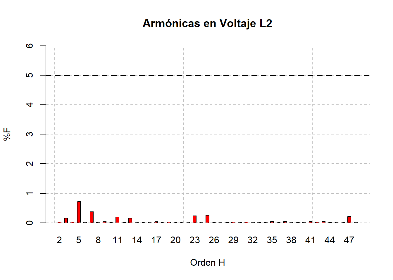 Las armónicas de corriente presentaron un patrón similar al mes anterior, con presencia destacada de las 23ª, 25ª y 47ª, cuyas magnitudes superaron a las armónicas de orden bajo (5ª y 7ª). El THD de corriente promedio fue de 3.3%, menor a los cuatro meses anteriores que fueron de 9.43%, 2.95%, 6.82% y 4.8%, respectivamente. Aunque este nivel no representa un riesgo inmediato, se mantiene una tendencia estable en meses anteriores.